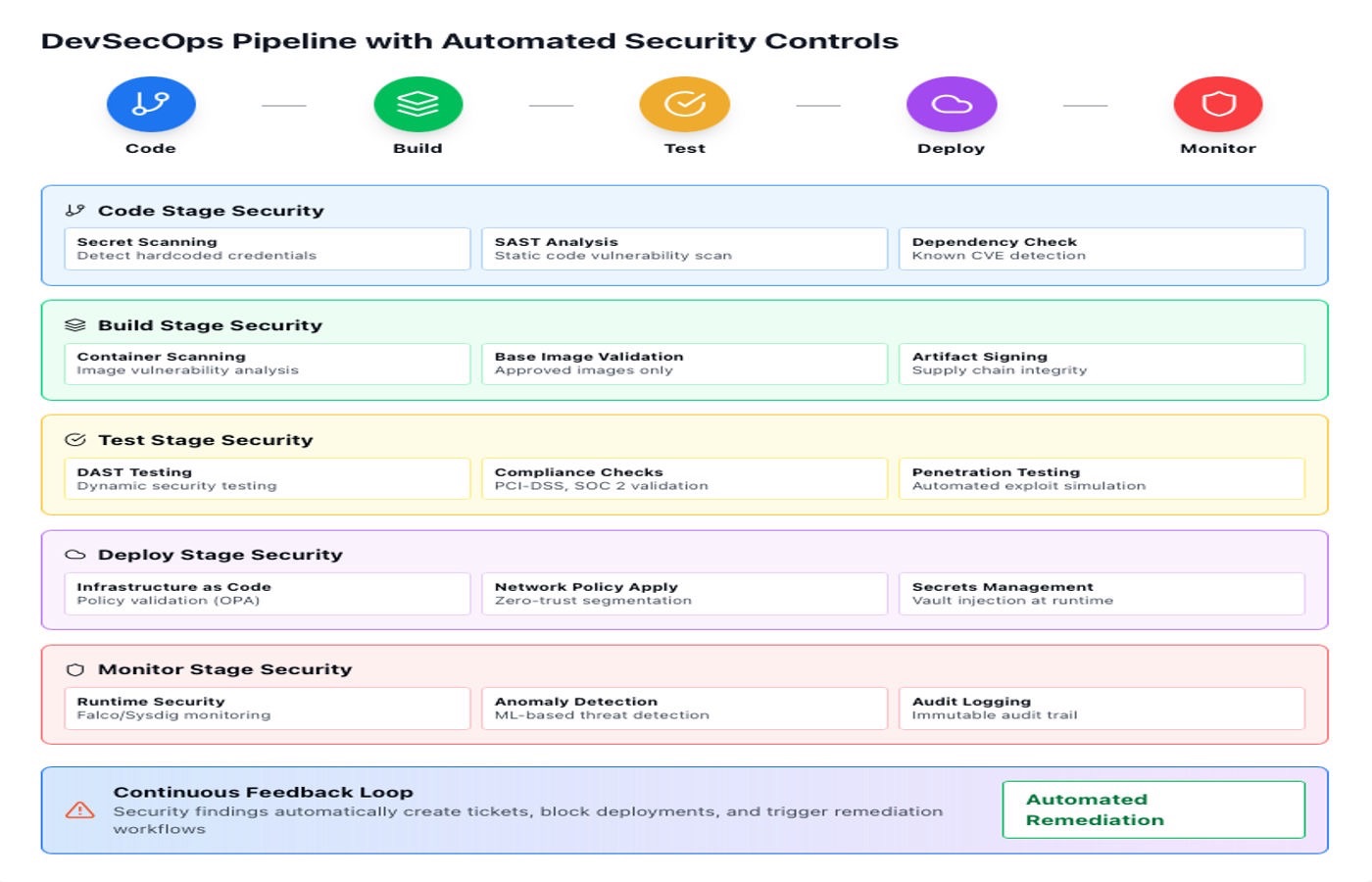 These controls cannot exist as parallel processes that teams can bypass. They must be embedded directly into CI/CD pipelines as automated, non-optional security stages that execute consistently from code commit through production deployment.