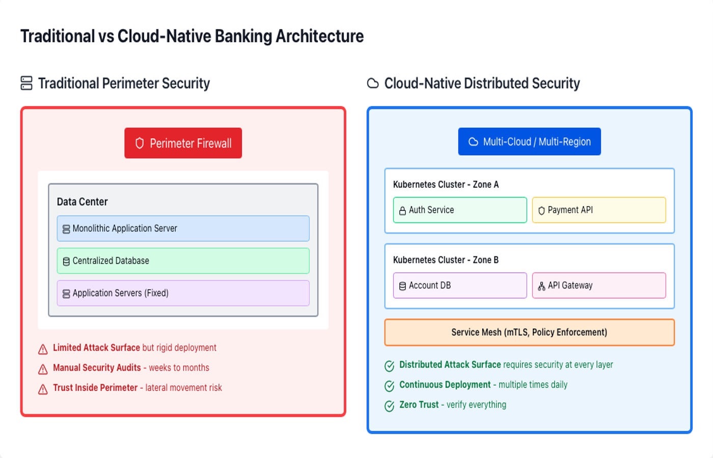 Traditional banking security focused on protecting well-defined perimeters: data centers with controlled access, firewalls between networks, and periodic security audits of relatively static systems. Cloud-native banking operates in a fundamentally different threat landscape.