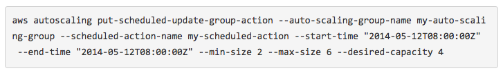 Detail: http://docs.aws.amazon.com/cli/latest/reference/autoscaling/put-scheduled-update-group-action.html