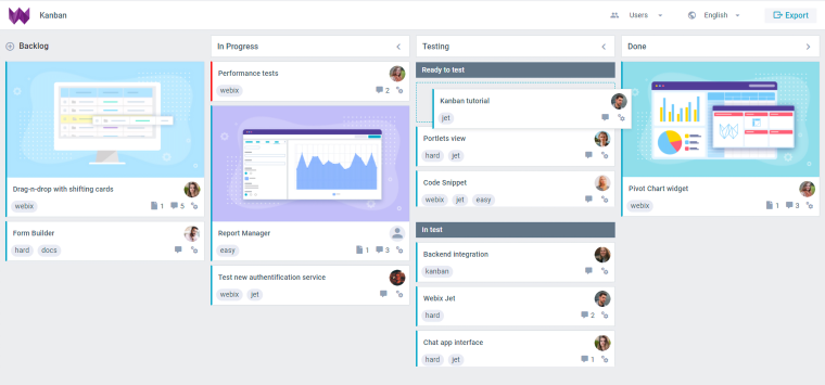 Kanban is one of the methods of planning and managing tasks right-on-time. Webix offers a ready-made Kanban JavaScript component that can be built into any project management app. Use JS Kanban application to save time for the design and development.
