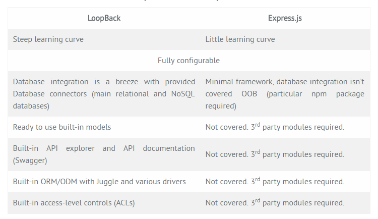 LoopBack is a highly-scalable opensource framework for creating APIs with little or no coding and linking them with backend data sources. In a nutshell, it is built on top of Express and comes with a set of Node.js modules that can be used both independently and together to build REST APIs for client applications (anything like mobile, browser, etc.) in the easiest way.