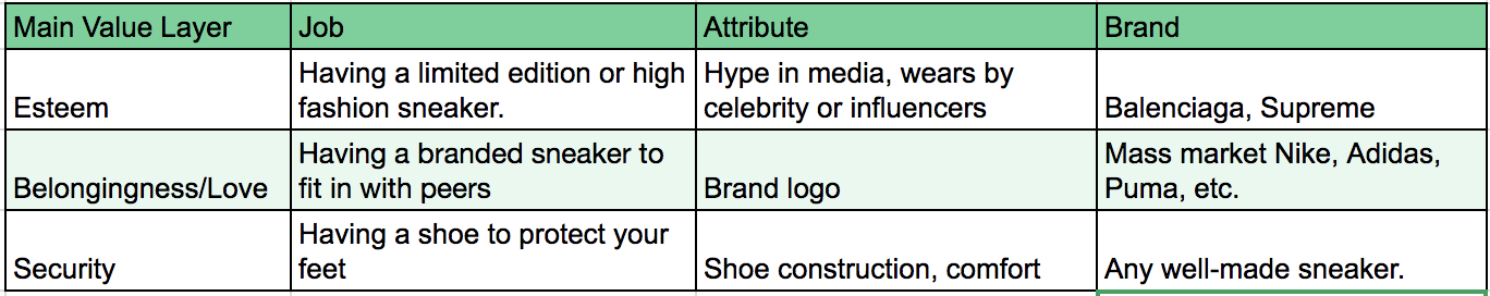 - Elaborate their product’s value for that job by listing which attributes satisfy which needs layer in Maslow’s hierarchy.