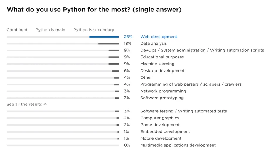 In the survey, it is shown that 26% of all python developers use the language for web development so 26% of the Python community is made up of Web developers, but Machine Learning and data analysis come in a close second with 27% combined so the Python Machine Learning community is very large and this means that you can easily get help anywhere you are stuck.