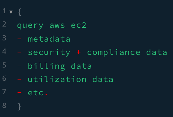 The second key idea is that data should be co-located with insights. When you aws ec2 describe-instances it would be incredibly useful to also see information about billing, security, compliance, CloudWatch, etc. After all, the most fundamental unit of organization for any AWS service is the resource itself. For example, all data that you could ever want to know about EC2, such as cost, compliance, and utilization metrics, belong to an EC2 instance(s), so why not associate the resource with its full insight data? If we treat the resource as the primary “owner” of the data and begin to supplement that resource with additional data, we can vastly improve the cloud insight retrieval process.