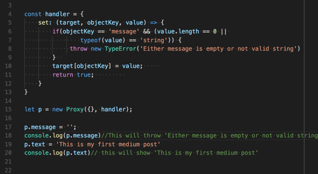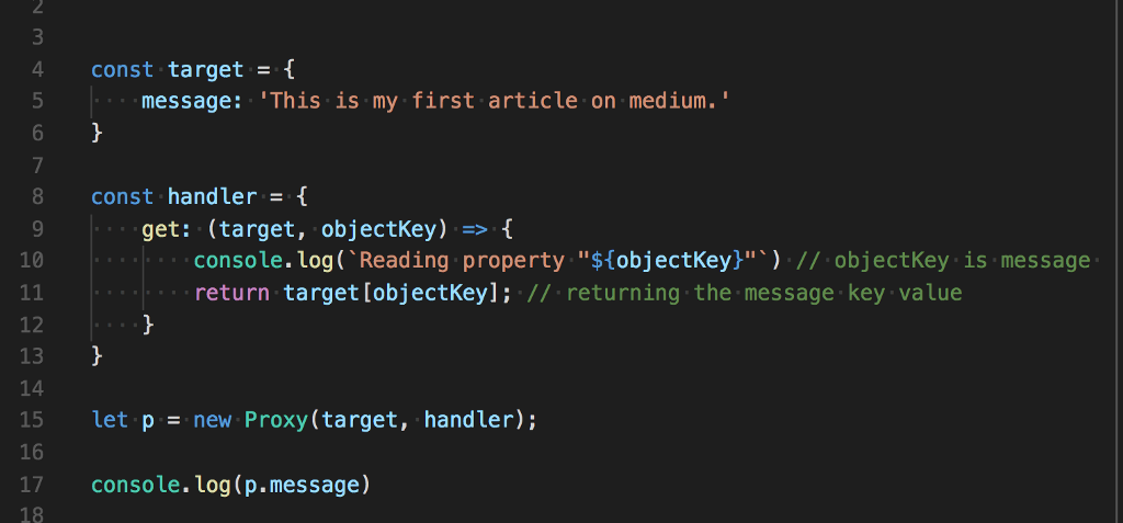 We made 2 objects called target and handler, target is a simple object with a message key and handler is an object that have a get key with a function associated with it. We pass 2 objects in proxy class and in return receive a proxy object by which we can access the message property of target object.
