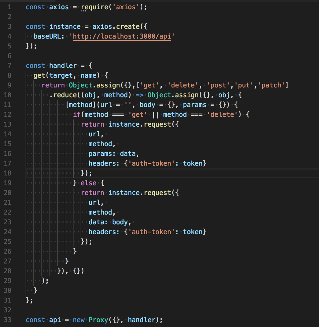 We have used axios, and then created an instance with our baseURL, created a handler for proxy that return an object of get, post, put, delete, patch function to be used, and at last made an api object which is a proxy object to an empty object target.