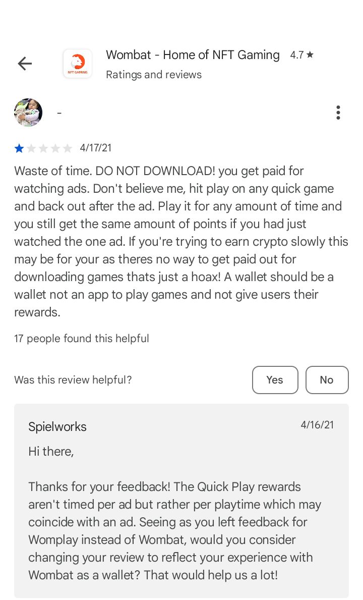 The Devs literally do not care about your investing, your expected rewards, etc. They're busy Phishing, Pumping and Dumping, and honestly trying to turn this NFT game into a ponzi scheme. I think it's at that point in their scam where the money they're stealing drowns out everything else. Reviews for WOMBAT in the Play Store seem to be artificial & Spielwoks doesn't seem to give a f*** about their Dev profile. 4-5 star reviews seem to be from bots & critical reviews have gotten the same copy/paste fake apology since 2022. Mind you, $WOMBAT only been official for just maybe 5 years.