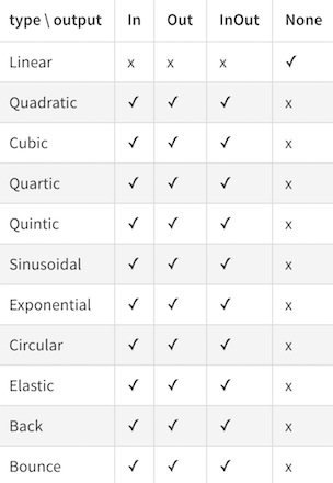 We used a easing-functions package and expose its functions through the Between.Easing object. So if you mind to expand the easing collection, please contribute to that package and we’ll update its version in the dependencies to include more varieties of easings. At the moment we support 31 easing mode: