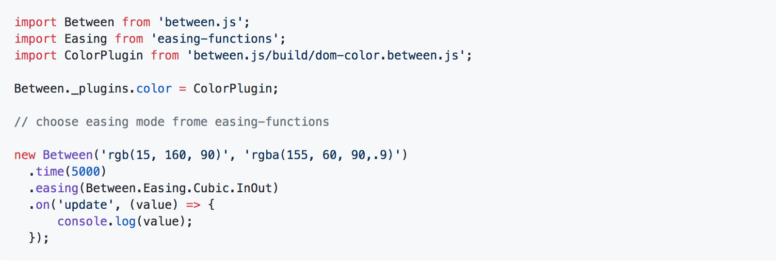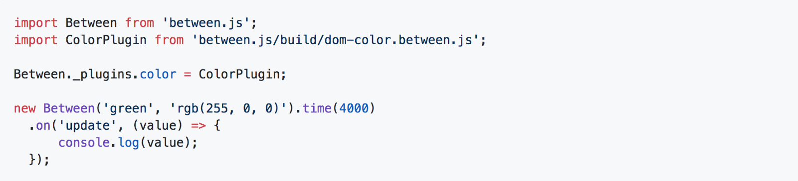 So let’s consider we are all webpack users and interested in dom-color plugin and we want to include it the usual way — with harmony modules. It’s a little bit more tricky than in browser, but turns out it is just as simple as it can be. The only thing we have to do is to import a ColorPlugin (as default) and assign it to internal Between._plugins object. The property name doesn’t matter, but I advise you to keep its name related to avoid further confusions.
