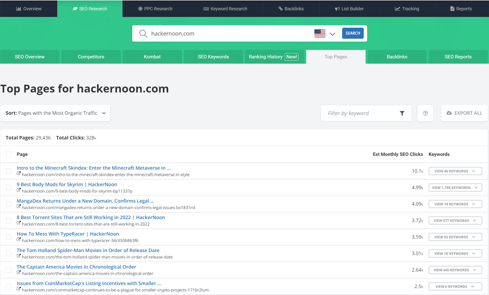 To figure out the top articles on Hackernoon, you can use something like SpyFu, SEMRush, or Ahrefs. Each tool has its own metrics and will serve you well. Beginners may want to try SpyFu for its affordable entry pricing.