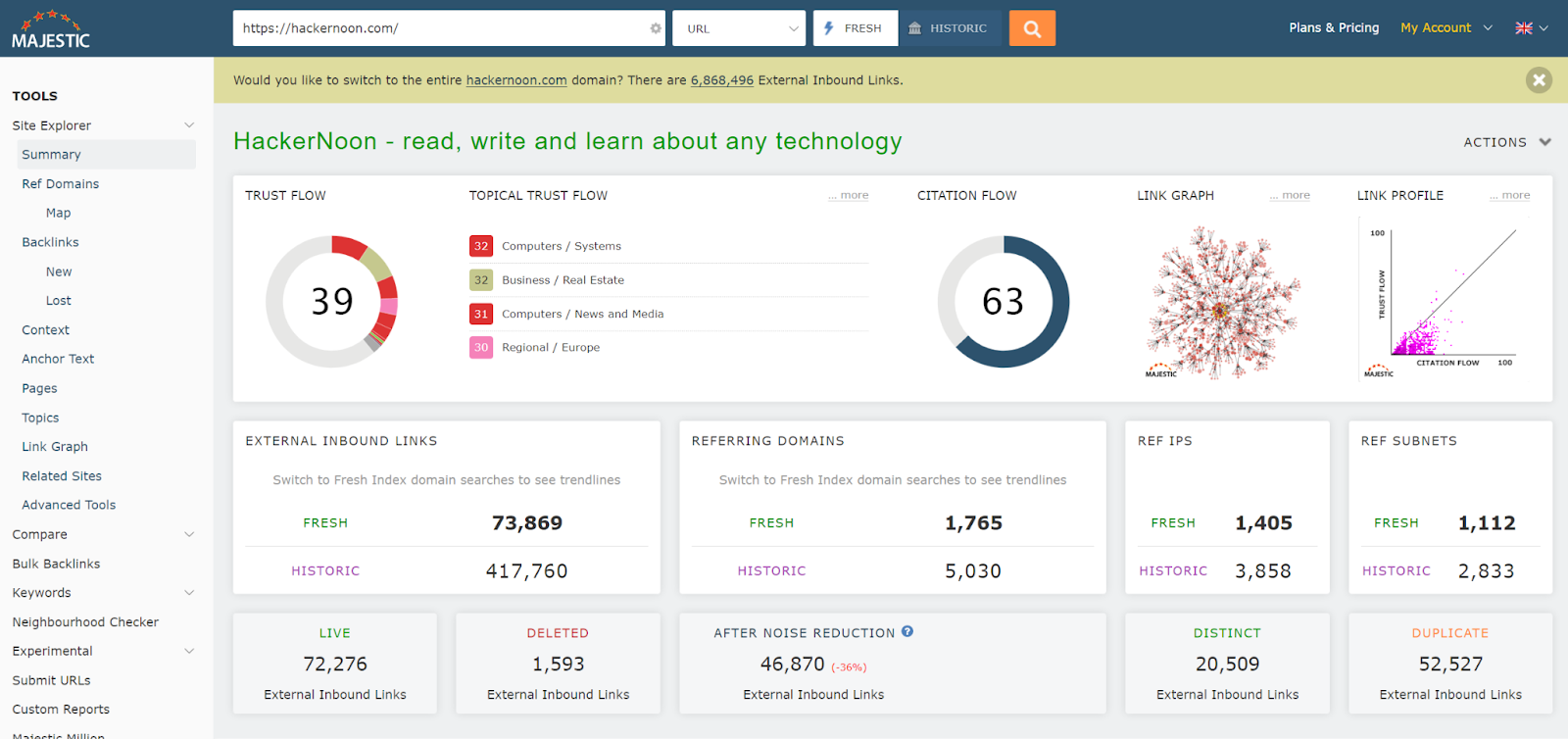 I found all of this data readily available in MajesticSEO, a popular solution for backlink research. You can use some free alternatives if you’re on a budget, like SEOGlass or Ubersuggest. They won’t get granular, but you’ll still be able to create your dataset.