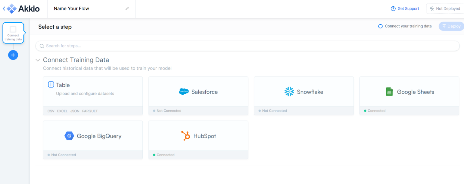 You can upload the dataset to Akkio through the Google Sheet integration, a direct CSV upload, or any of the built-in CRM and marketing integrations. Let’s do it with a manual upload for now.