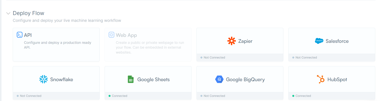 You can deploy the model in a variety of ways: API, web app, Zapier, and direct integrations of Akkio.