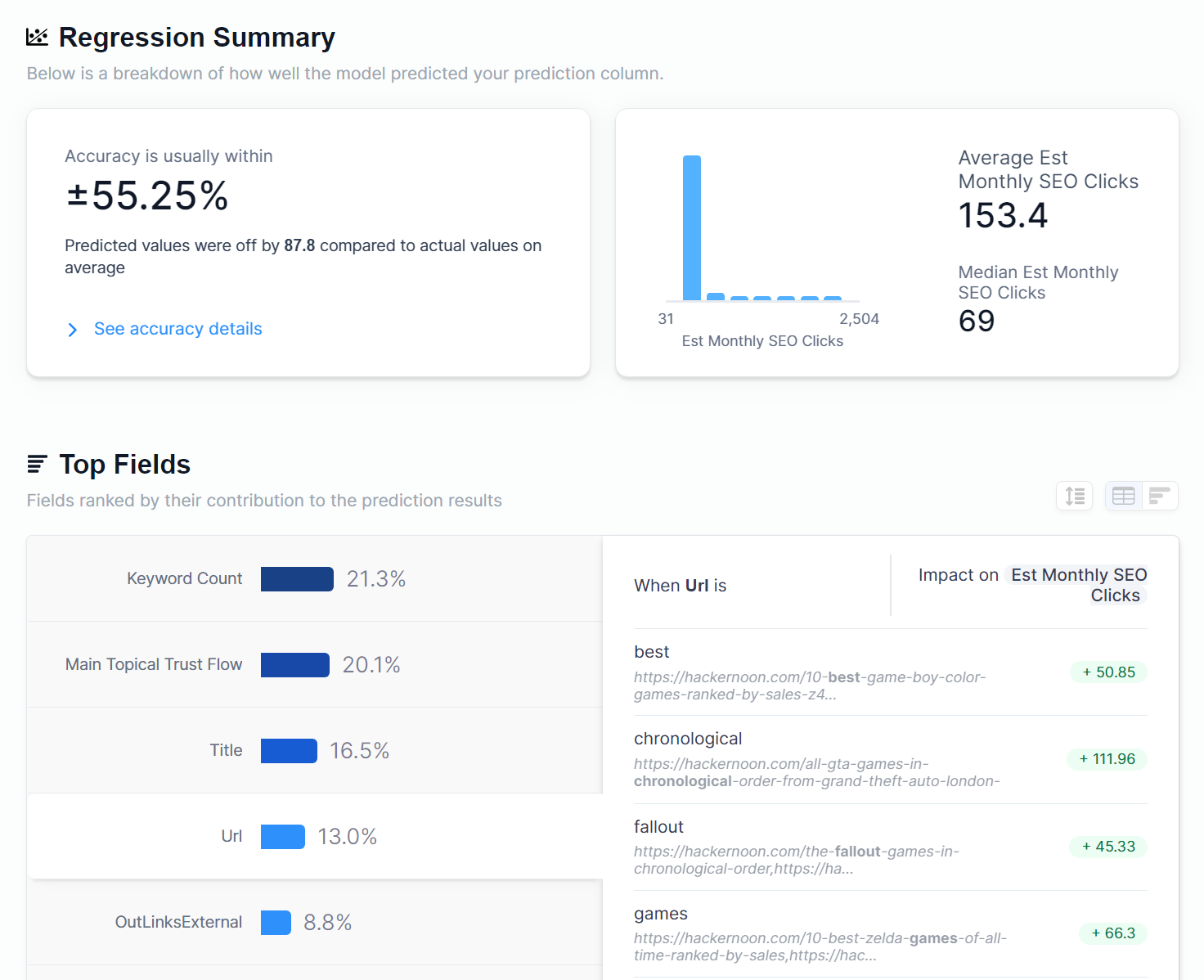 The report also shows the accuracy level. Because our dataset has a large range of possible click values and is heavily weighted towards the low end of clicks, we get an accuracy that is usually within 55% - but the statistic to pay attention to here is the “off by” of 88 clicks. That's actually pretty good for our purposes!