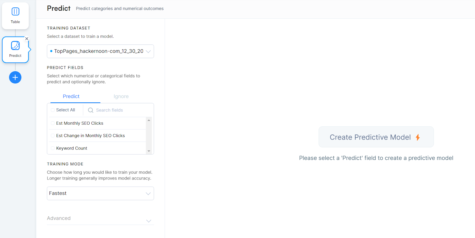 Before you click predict, double-check that you selected the correct value to predict. I want to predict the potential for “SEO Clicks”, so that’s my prediction target.