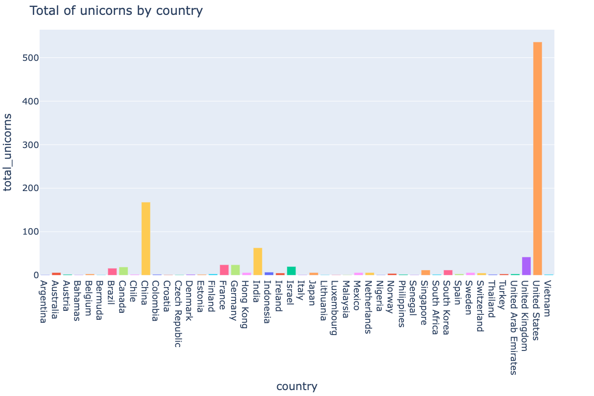 The plot below is one example of a plot made with our country_stats table. We can quickly see the US leading the world in the total number of Unicorn companies.