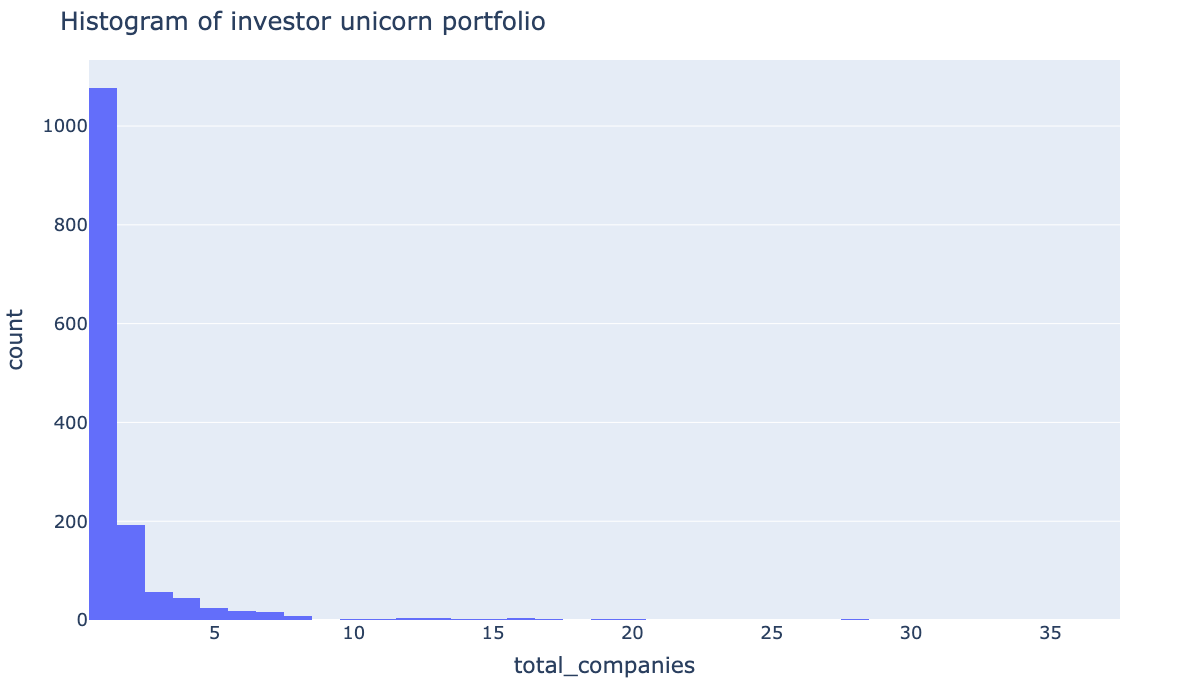 The histogram below shows the distribution of investors by the total number of Unicorns in their portfolio. We see a power-law type distribution where most investors have only 1 unicorn, whilst few have invested in many. This type of distribution can also be found in populational monetary wealth and social networks.