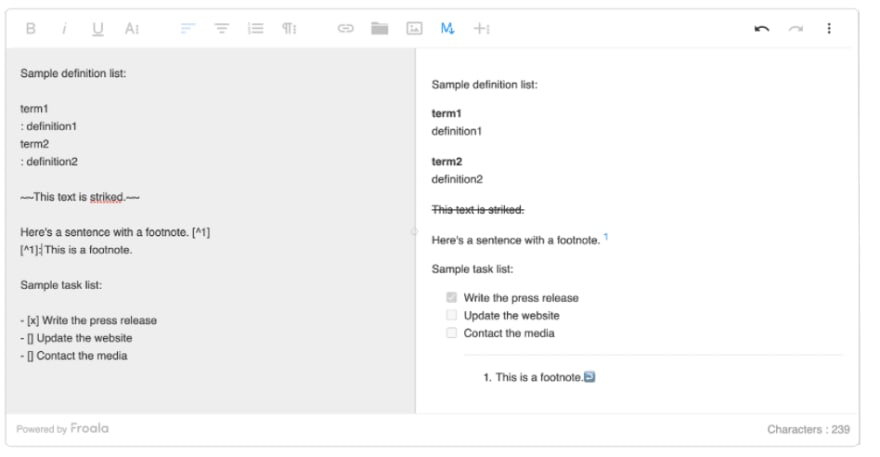Markdown support allows Froala’s users to quickly add Markdown syntax to their text to indicate words and phrases that need formatting. The editor provides a simple split-screen interface to observe the changes in real-time.