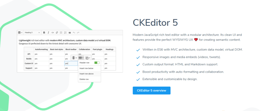 CKEditor is another amazing JavaScript WYSIWYG editor for creating rich text content and simplifying web content creation. Like Froala, CKEditor has a neat design and provides a good user experience for creating semantic content.
