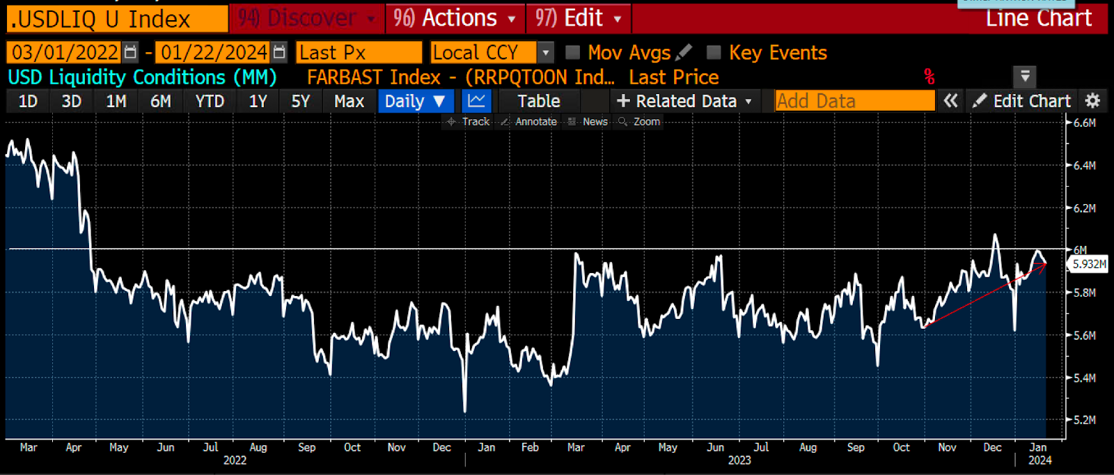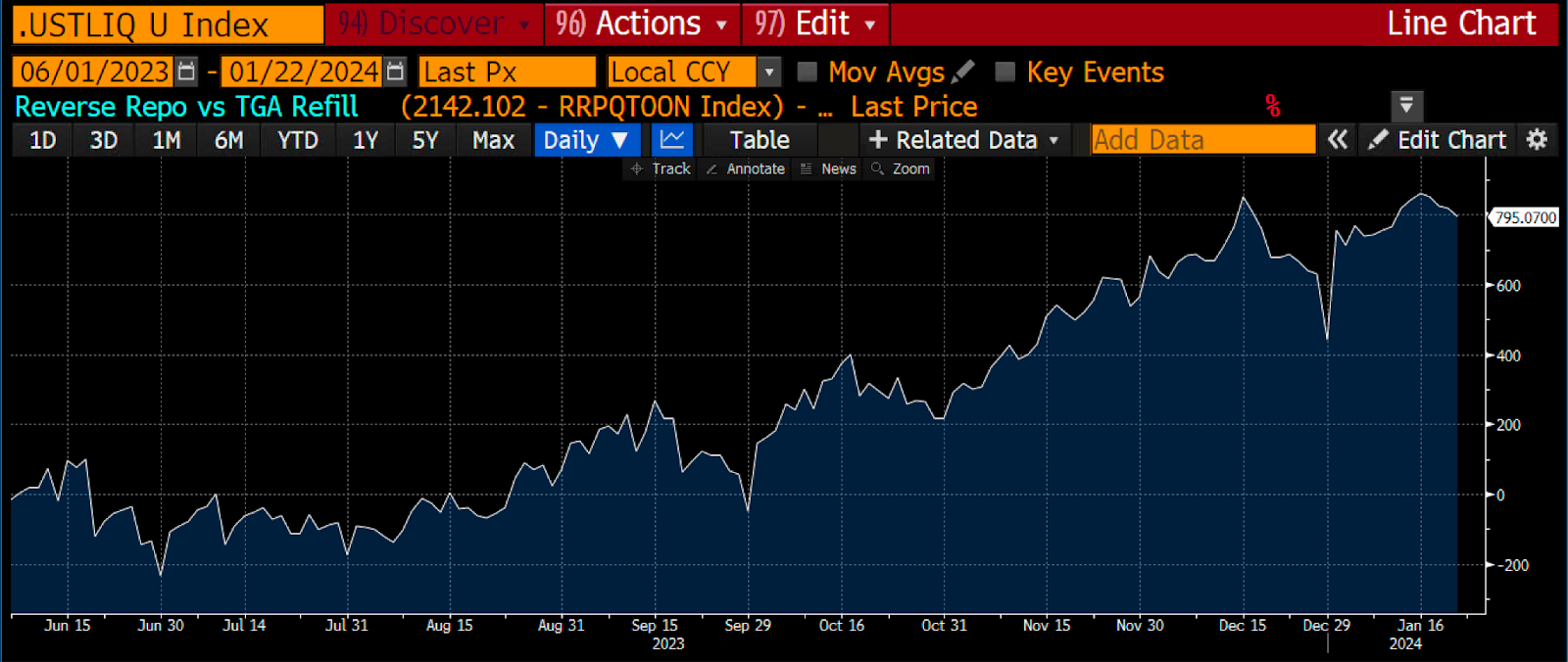 This chart is a subcomponent of the index, which is the net of RRP and TGA balance changes. Since the US government passed its budget in June 2023, almost $800 billion of liquidity has been added.