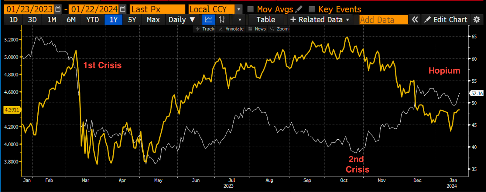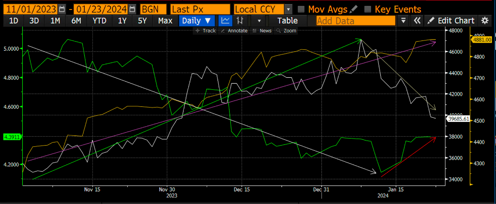 The market I’m referring to is the S&P 500 and the Nasdaq 100, which both hit new all-time highs. But all is not well. The real smoke alarm for the direction of dollar liquidity, Bitcoin, is throwing a cautionary sign. After the US spot ETF launch, Bitcoin has sagged from a high of $48,000 to below $40,000. Coinciding with Bitcoin’s local high, the 2-year US Treasury yield hit a local low of 4.14% in mid-January and is now marching upwards.