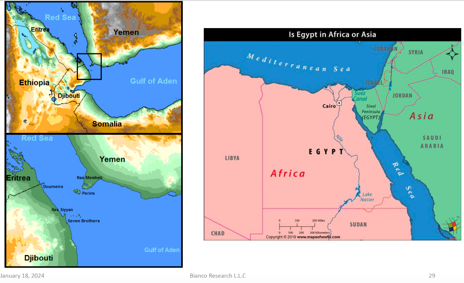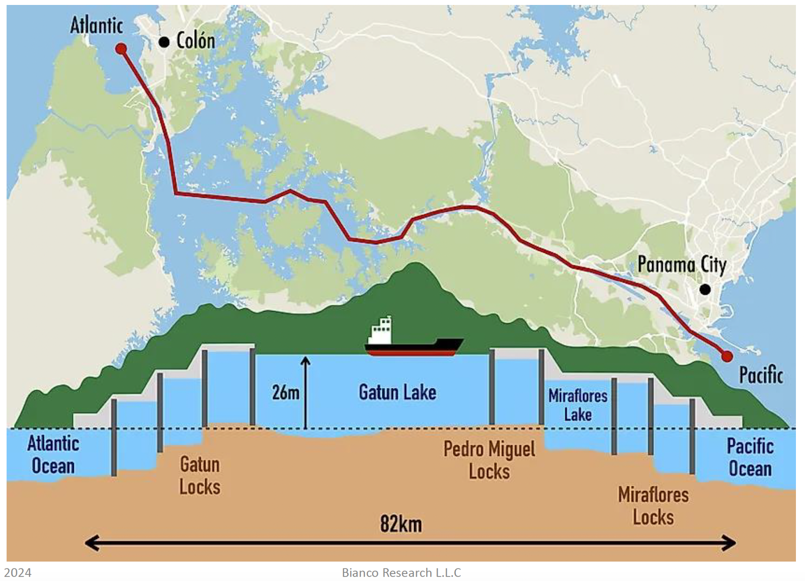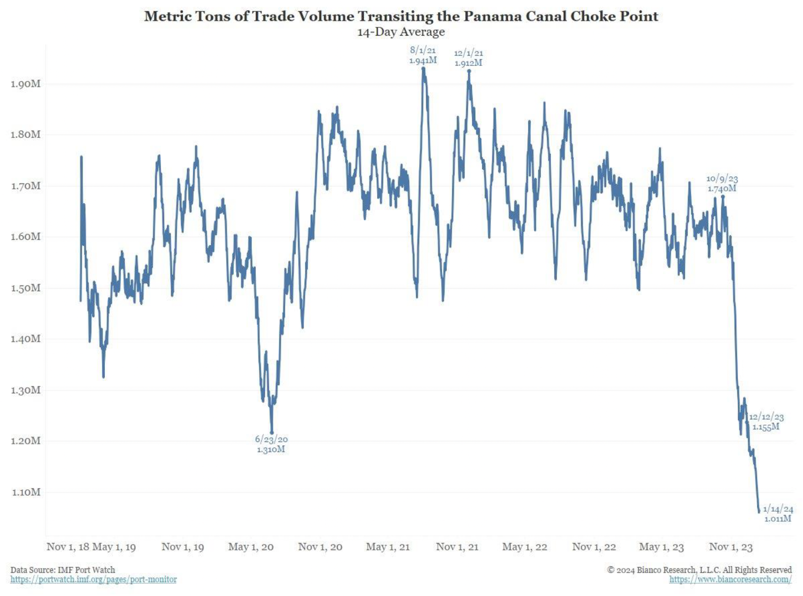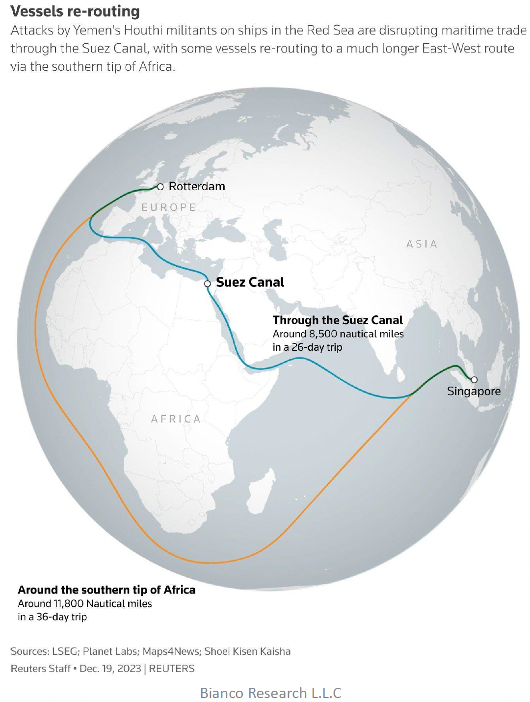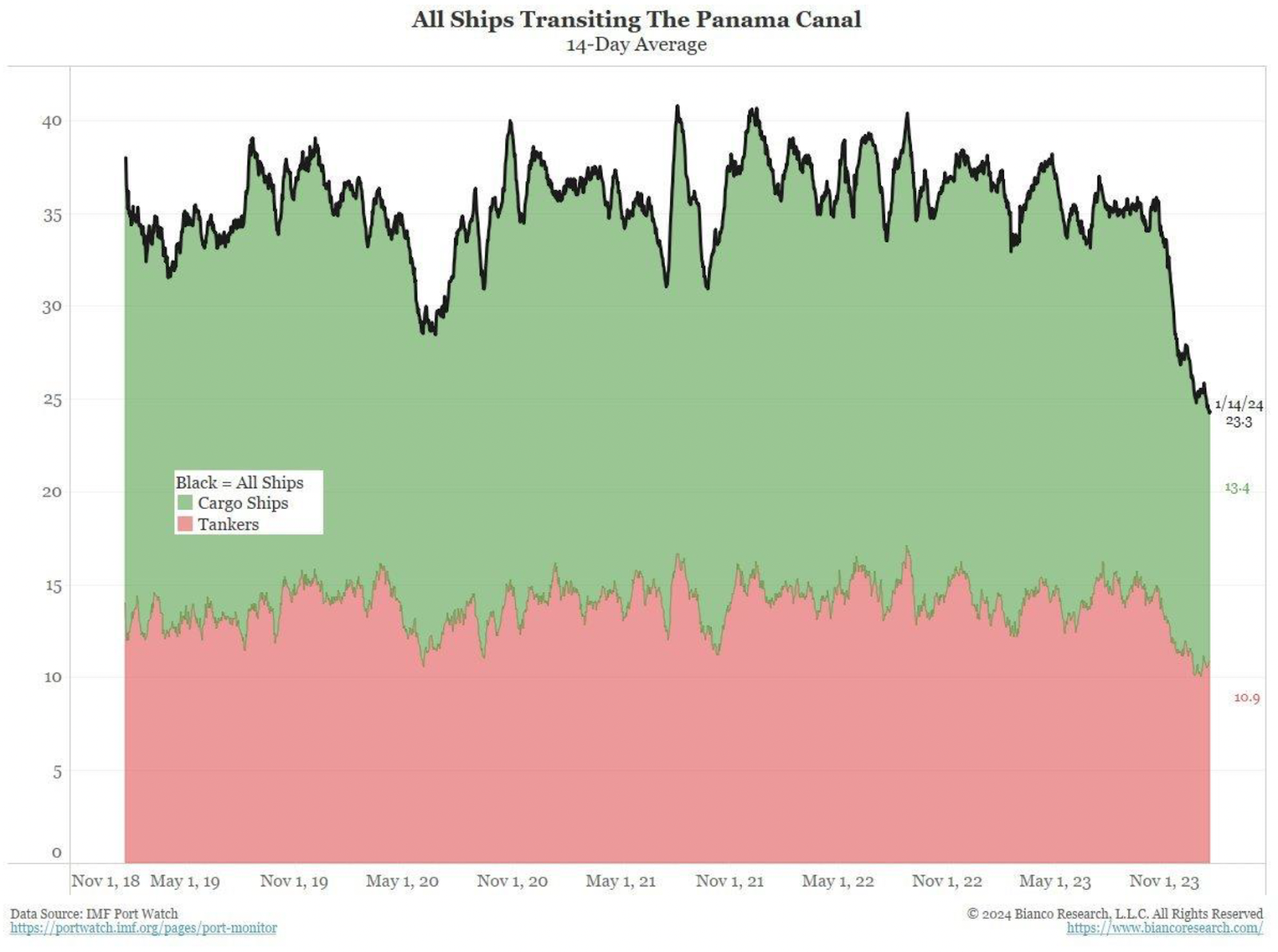 Reducing shipping activity through the Panama Canal is important because the US was rerouting some goods through Europe to Eastern seaboard ports to avoid the canal. But, given that goods from Asia to Europe loaded on Western ships must now travel around Africa rather than through the Red Sea, delivery costs and time will increase.