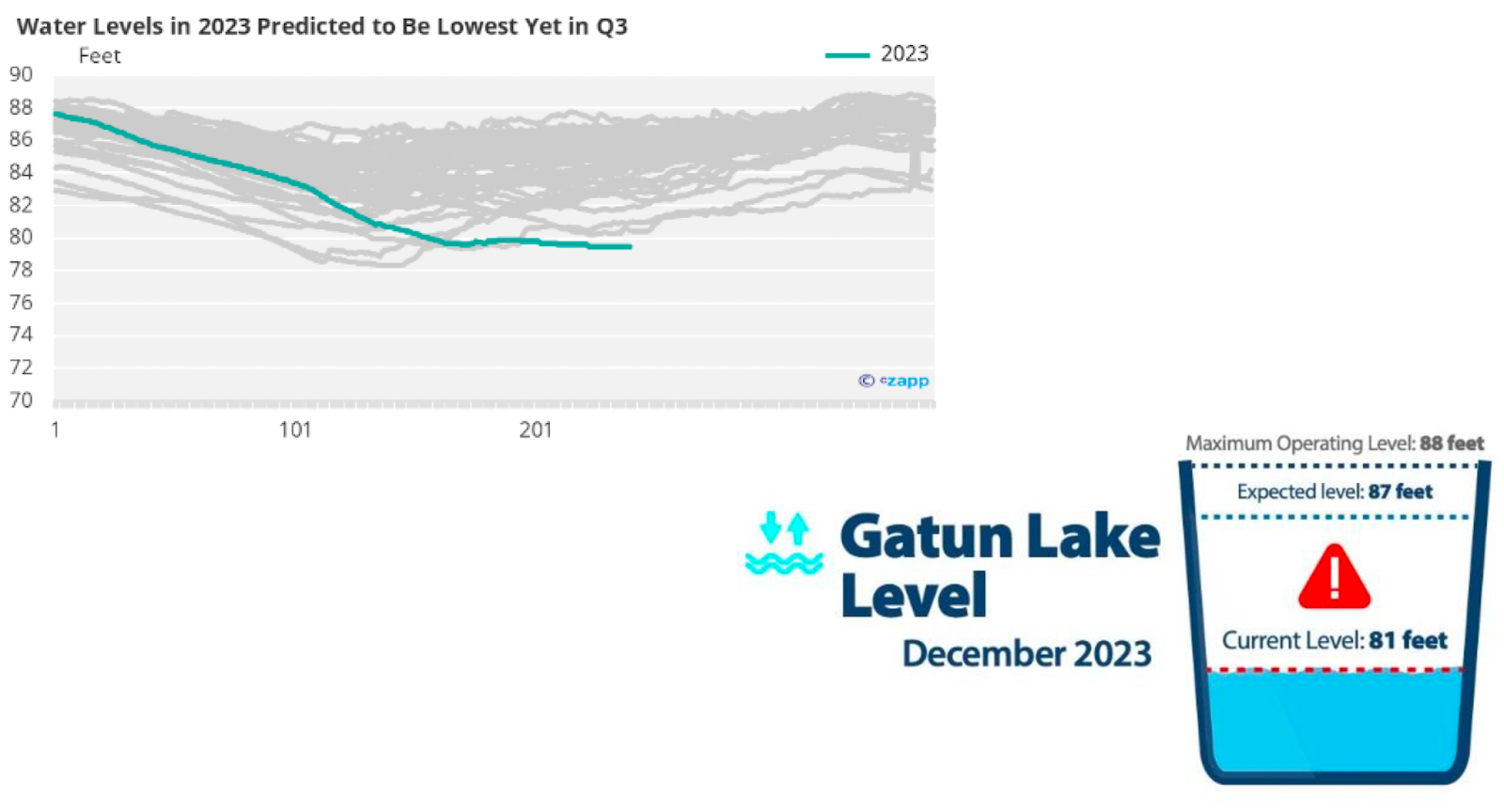 The El Niño weather pattern is just getting started. A mild El Niño typically lasts for one to two years. However severe this El Niño is, it will still be present in November of this year. Sadly, if you are a Biden supporter, he can do nothing about the weather. Humans are not even a Kardashev Type I civilization. El Niño and climate change in general have lowered the Panama Canal’s water levels, reducing the number of ships that can transit.
