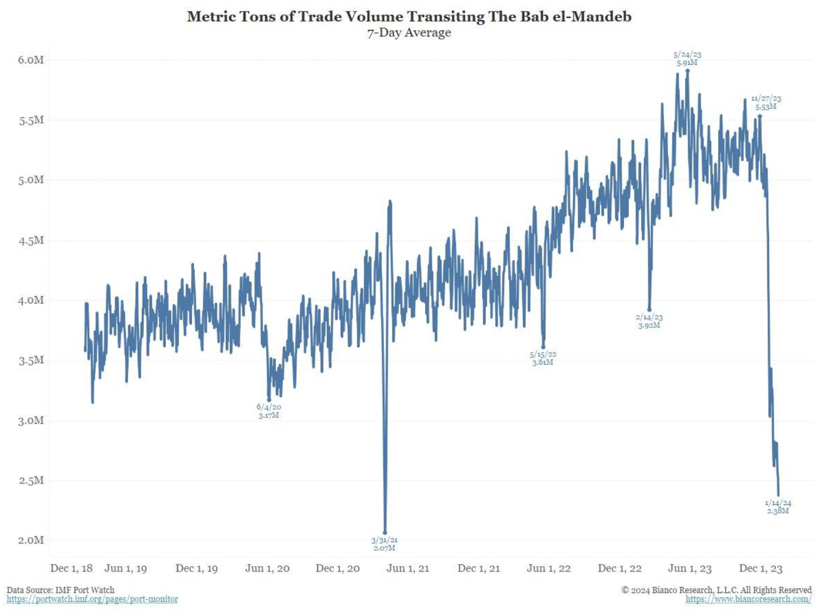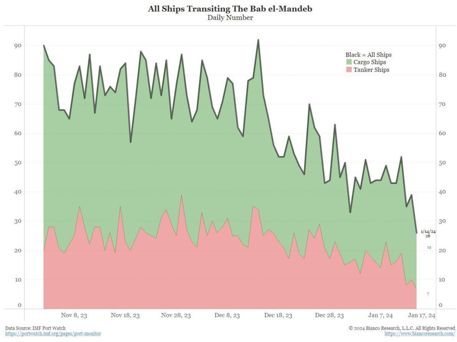 The Fed would rather just jawbone the markets with speeches and Wall Street Journal op-eds because they are deathly afraid of inflation. The war-mongering muppets in charge of Pax Americana’s foreign policy have now bungled their way into another Middle Eastern war with no end against the Yemen Houthis. Later in this essay, I will expand on why this war in the Red Sea is important, and could lead to an uncomfortable spike in goods inflation just in time for the US elections in November this year.