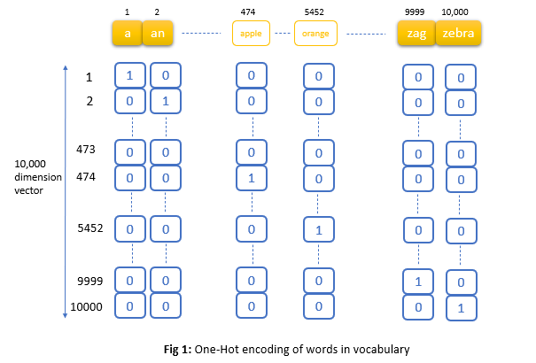 Any deep learning model needs to have some sort of numeric input to work with. In computer vision its not a problem as we have pixel values as inputs but in Natural language processing we have text which is not a numeric input. One common way to convert text to numbers is to use one-hot representation. For example, let’s say we have a 10,000-word vocabulary, so any word can be represented by a vector of length 10,000 with 0’s everywhere except a one ‘1’ in words position in vocabulary.