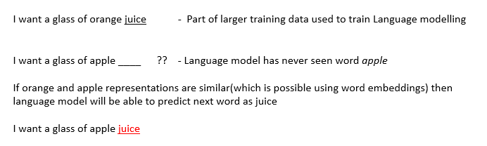 As we have seen above in the example, even though our training data for language modeling does not have the word apple, if representation for apple is similar to the word orange (both are fruits so we expect most of the characteristics of them are same, so similar representation) then our language model is more probable to predict next word as juice in sentence I want a glass of apple.