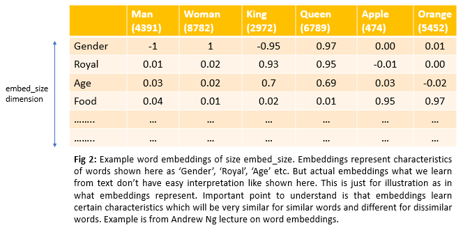 Word embeddings are continuous, vector space representations of words. Word embedding vectors usually have dimensions around 300(in general embed_size). So each word in the vocabulary is represented by a vector of size 300. But what does each value of this vector of embed_size represent? We can think of them as representing certain characteristics like age, food, gender, size, royal, etc. Let’s go through an example to understand this in detail. Even though the below example shows that embeddings are represented by characteristics like age, food, gender, etc., embeddings which we learn won’t have an easy interpretation like component one is age, component two is food, etc., Important point to understand is that embeddings learn certain characteristics which will be very similar for similar words and different for dissimilar words.