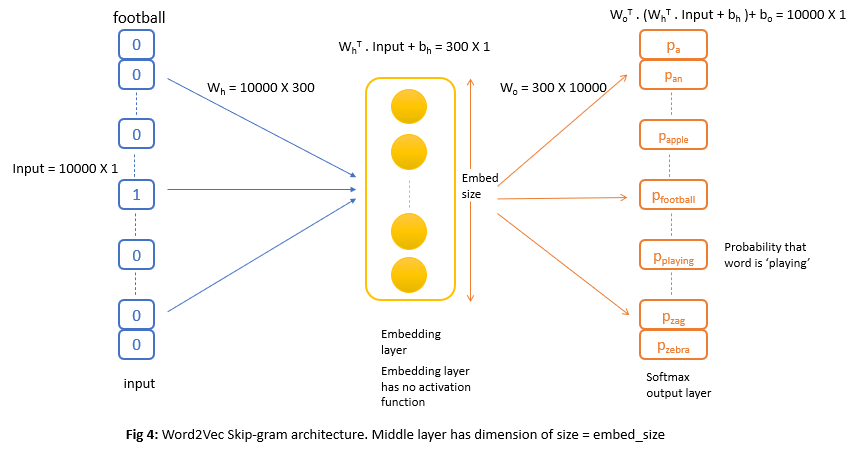Each training input as shown in fig 3 will be first represented as one-hot vectors that go in to model as shown in fig 4. Then we have an embedding layer with the number of neurons = embed_size(usually this is set to 300) and the output layer will be 10,000 neurons softmax(here vocabulary size = 10,000) that outputs the probability of each word in the vocabulary.