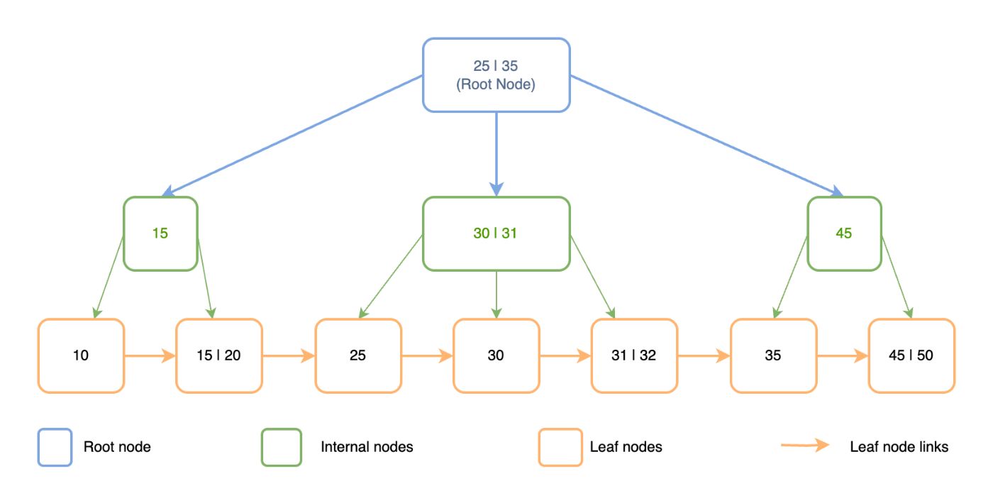 - Leaf nodes link together through a doubly-linked list structure, which enables efficient range scanning operations