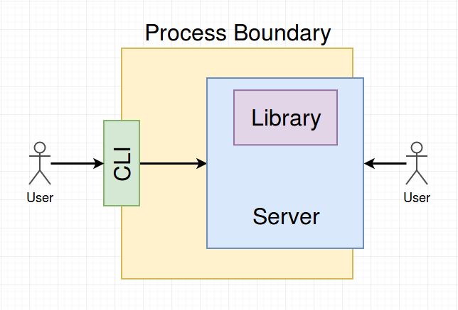 If you’re going to build a server for your CLI, and clients integrate with your server, then that’s where the logic should live. Your CLI then just becomes another client. Visually we can think of it like: