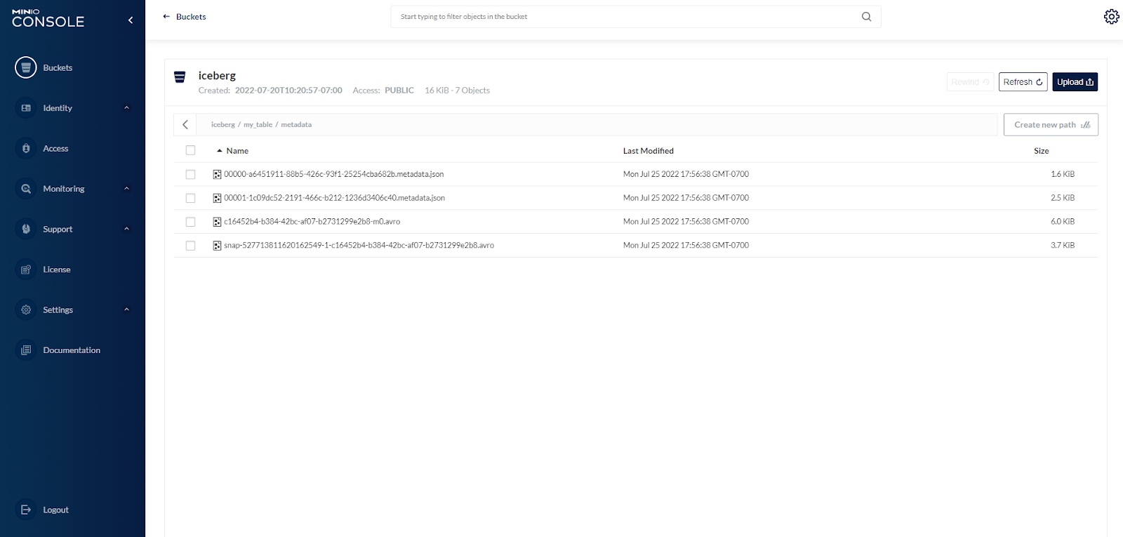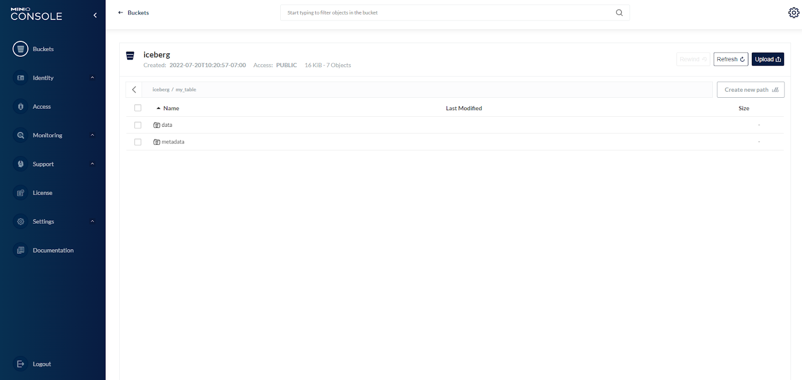 Next, let’s insert some mock data and watch the files that Iceberg stores in MinIO. Inside the iceberg bucket, there are now my_table/metadata and my_table/data prefixes.