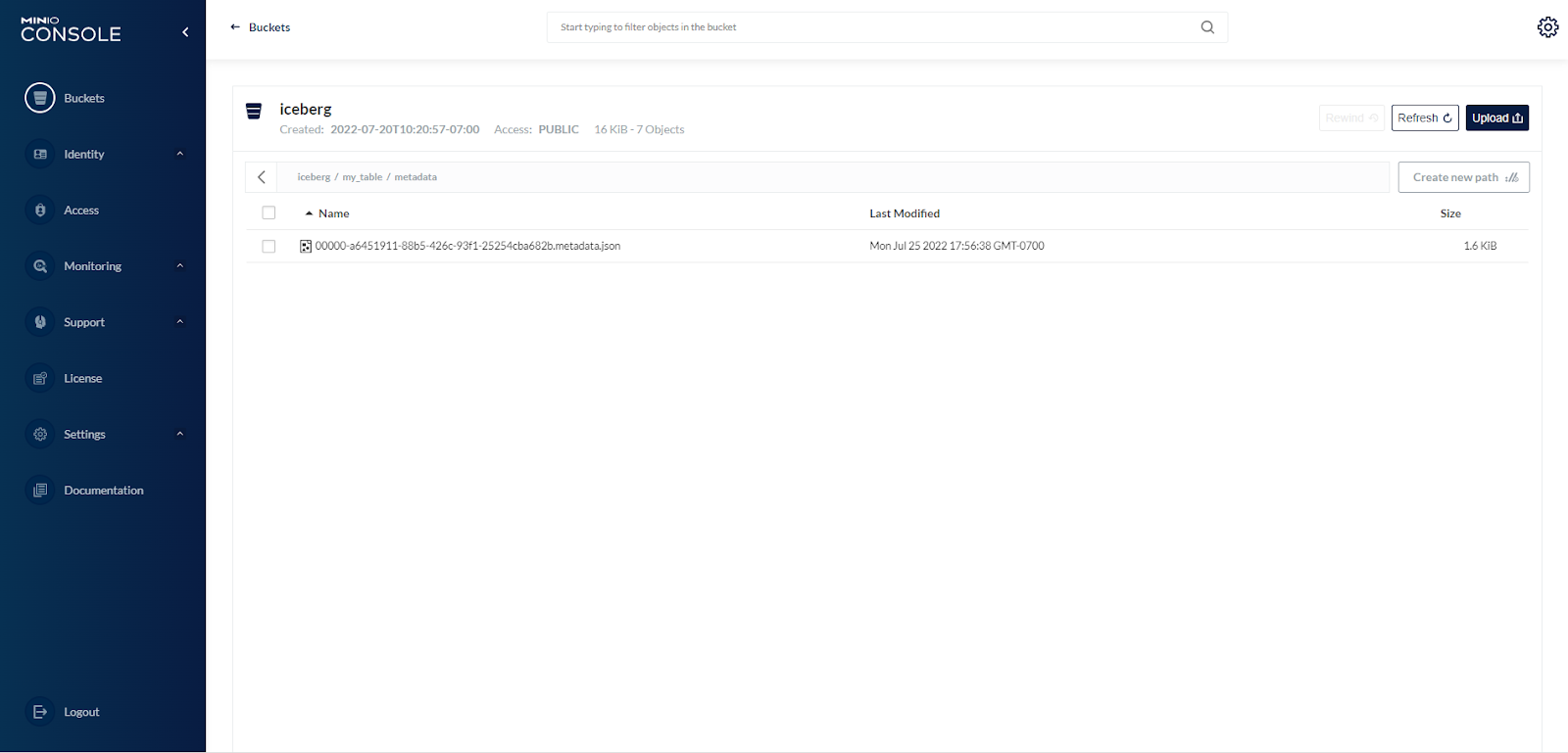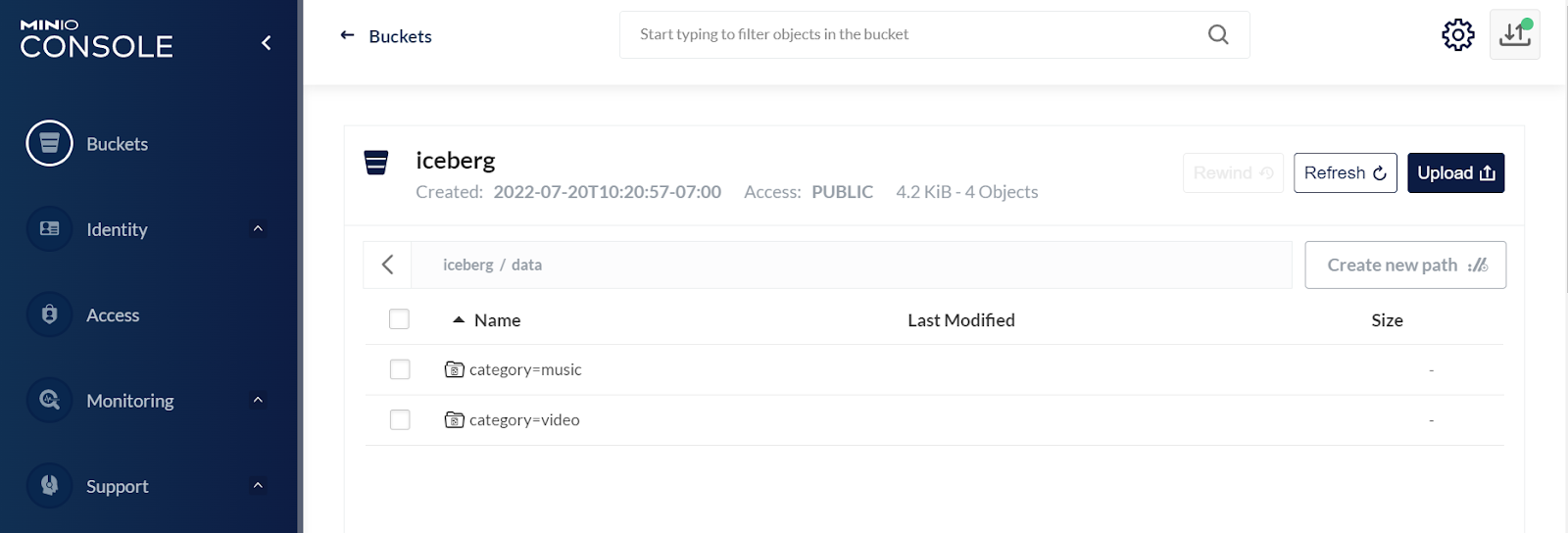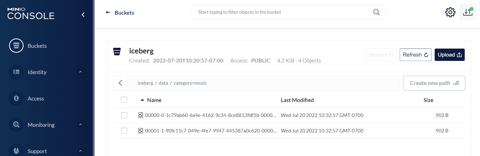 Bucket created successfully `myminio/iceberg`.