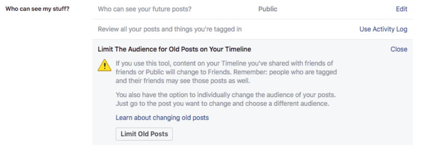 Back in Settings, there’s an option to limit the audience of past posts. That means that no matter what permission you gave previously, all of your old posts will be switched over to friends. This is a handy option when, for example, you’re applying for jobs and would prefer that potential employers had a more limited view of your activity online.