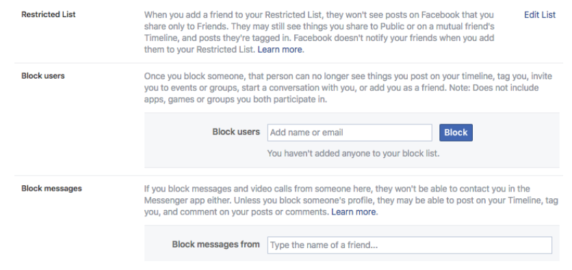 Pretty self-explanatory: This allows you to block messages and video calls. It doesn’t, however, prevent someone from posting on your timeline, tagging you, or commenting on your posts and comments.