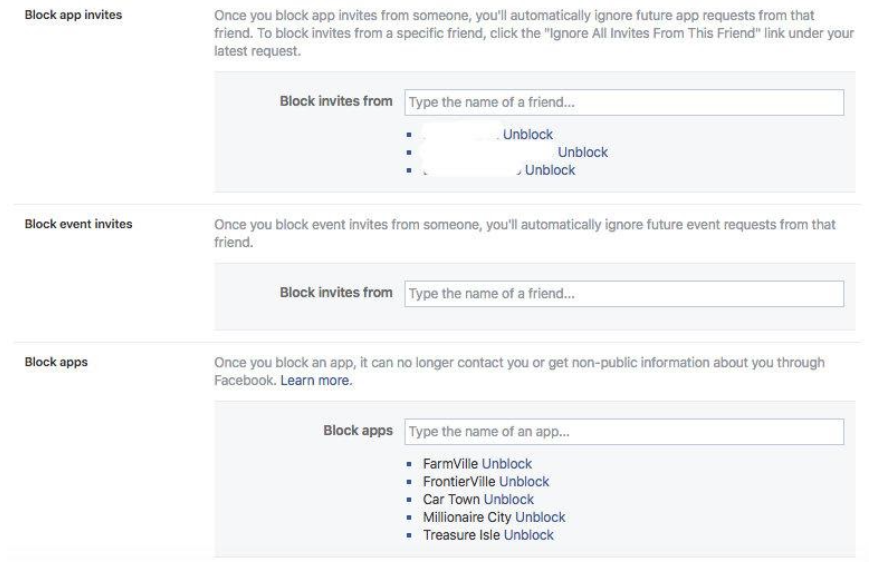 This section lets you block apps, preventing them from contacting you or getting any info about you that isn’t already public on Facebook.