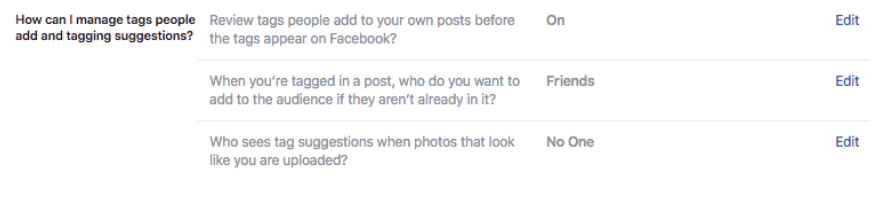 With tagging, anyone can add your name to any image. But with the managing tags section, you get to decide both who can tag you and where those tags will be seen. The first option is “Review tags people add to your own posts before the tags appear on Facebook?” which can be toggled to “enabled” or “disabled.” If a stranger asks to tag your post, you’ll always be notified before it’s added but this helps you decide what your friends can tag.**
