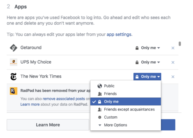 So the best move is to delete any apps you’re no longer using from your Facebook profile. Just review the apps that are currently connected with your Facebook account and click the little “x” on the ones you don’t want to be connected to anymore. You also have the option to delete any posts associated with the app from your timeline and whether or not you want your use of the app to be visible to anyone else online.