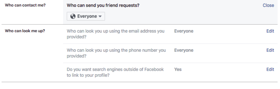 If you want to enjoy Facebook but don’t want to be accessible to everyone in the world, you can limit both who you want to allow to contact you and who can look you up on Facebook. Under “Who can contact me?” you can choose who on Facebook is allowed to make friend requests — “Everyone” or “Friends of friends.” Under “Who can look me up?” you can decide whether or not people can look you up via your email address, your phone number, and whether or not external search engines link to your profile.