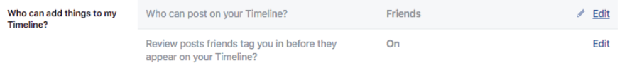 The first section lets you choose who can post things on your timeline, as well as when those posts will go live on your timeline. If you don’t want anyone to post on your timeline, choose “Only me.” If you want to make sure you know what’s going to be posted before it’s up there, enables the option to review posts.