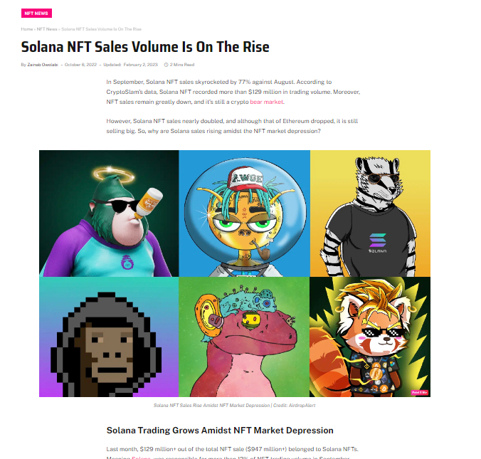 The article image below shows how h1 and h2 are used in web content. ‘Solana NFT Sales Is On The Rise’ uses the h1 tag, while ‘Solana Trading Grows Amidst NFT Market Depression’ uses the h2 tag.