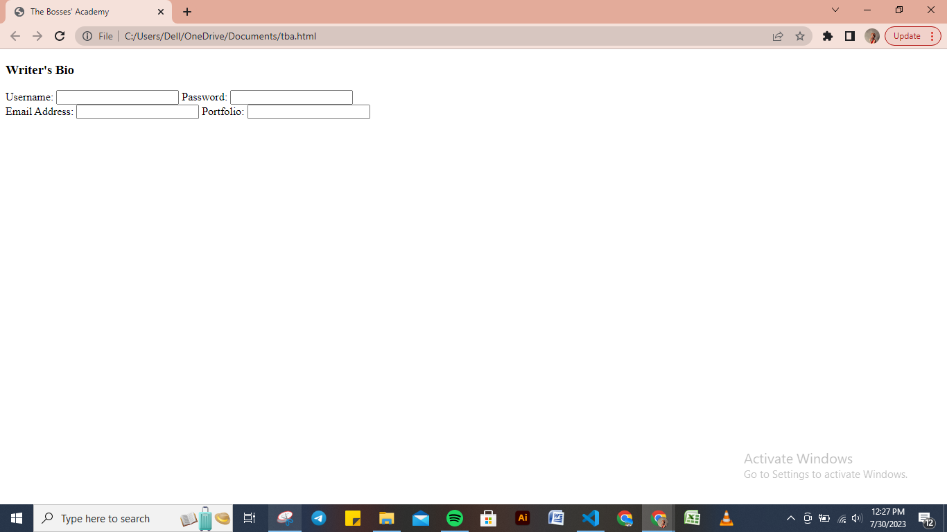 It asks users for input and provides information about what kind of input users should give through the type, id, and name attributes. For example, the username has a text type, i.e., thebossesacademy, but its id value has to be the same as the for attribute's value.