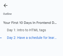The hgroup element is used when grouping heading tags. For example, the heading of this article: Your First 10 Days In Frontend Development, and the subhead: Day 1, belong to the same hgroup. Here is how it looks on my Google doc.