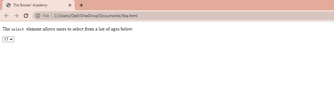 <p> The <code> select </code> element allows users to select from a list of ages below </p>