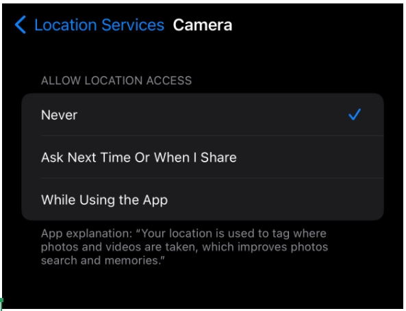If you don’t want your location added to images going forward, you have to change the permissions on your phone. iPhone users can go to “Settings,” then “Privacy,” then “Location Services.” Scroll down until you get to Instagram and change location access to “Never.”