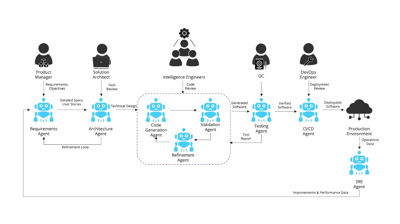 This is the long-term vision. A swarm of interconnected, specialized agents can take on an entire product epic or even a small project. A human product owner sets the business goals and constraints, and the agentic system autonomously coordinates to plan, develop, test, secure, and deploy the solution. Humans are responsible for the 'what' and 'why,' the agents handle the 'how.'