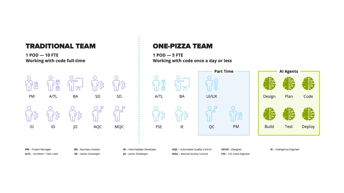 As a result, the shape of engineering teams is changing. Traditional teams might include 8–10 developers focused full-time on building features. In the agent-augmented model we’re now piloting, that same team might have five human engineers — and a set of agents generating stubs, tests, configs, or documentation. We call it “one-pizza team.”